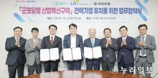 (누리일보) 군포시는 2일 군포시청에서 한국토지주택공사(LH), ㈜유한양행과 ‘군포당정 산업혁신구역’ R·D 전략기업 유치를 위한 업무협약을 체결했다고 밝혔다.