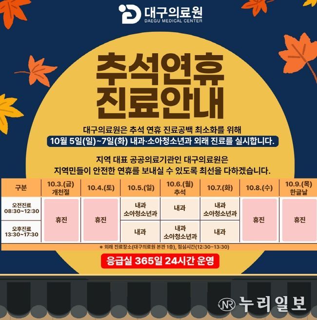 (누리일보) 대구의료원이 추석 연휴 기간(10.3.~10.9.) 응급실 운영을 강화하고, 10월 5일(일)부터 7일(화)까지 내과·소아청소년과 외래 진료를 실시한다.