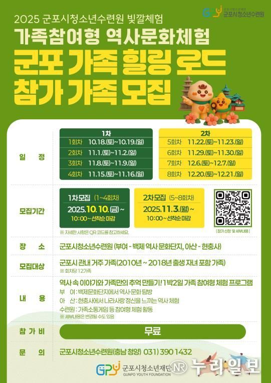 (누리일보) 군포시청소년재단이 운영하는 군포시청소년수련원(충남 청양)은 관내 가족을 대상으로 2025년 가족참여형 역사문화탐방 '군포가족 힐링로드' 참가자를 모집한다.