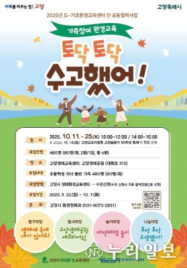 (누리일보) 고양특례시는 가족과 함께 참여하는 환경교육 프로그램‘토닥 토닥 수고했어!’를 오는 11일부터 25일까지 매주 토요일 고양생태교육센터와 고양생태공원에서 운영한다고 밝혔다.