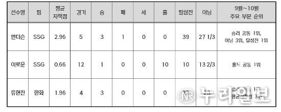 SSG 앤더슨은 9~10월 5경기에 선발 등판해 3승을 거두며 승리 부문 공동 1위에 올랐다. 평균자책점 2.96을 기록했고, 삼진 39개를 잡아내며 탈삼진 부문 월간 1위를 차지했다. 앤더슨은 9~10월 경기 당 평균 8개에 가까운 탈삼진을 잡으며 245탈삼진으로 정규시즌을 마무리했다.