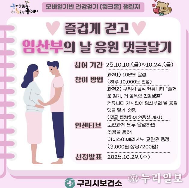 (누리일보) 구리시는 제20회‘임산부의 날’(10월 10일)을 기념해 임신과 출산의 가치를 되새기고 시민 건강 증진을 도모하기 위한 ‘즐겁게 걷고, 임산부의 날 응원 댓글 달기’ 챌린지를 오는 10월 10일부터 24일까지 15일간 운영한다고 밝혔다.