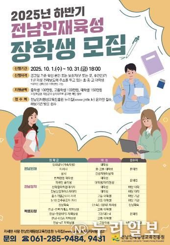 (누리일보) 전라남도와 전남인재평생교육진흥원은 실질적인 교육기회 보장과 미래인재로의 성장, 지역 정착을 지원하기 위한 2025년 하반기 전남인재육성 장학생을 오는 31일까지 모집한다.