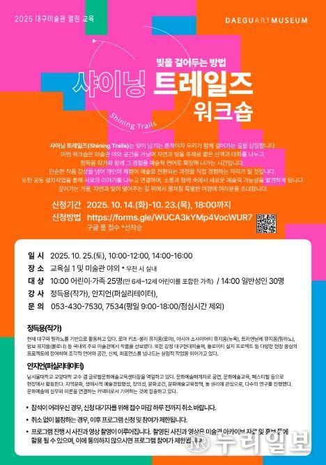 (누리일보) 대구문화예술진흥원 대구미술관은 오는 10월 25일, 오전 10시, 오후 2시, 총 2회에 걸쳐 열린 교육 ‘샤이닝 트레일즈 워크숍: 빛을 걸어 두는 방법’을 운영한다.