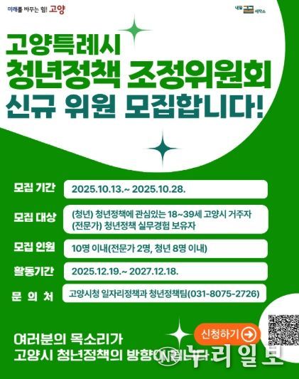 (누리일보) 고양특례시는 청년이 시정의 주체로 참여해 정책을 함께 만들어갈 수 있도록 고양시 청년정책조정위원회 청년 및 전문가 위원을 공개 모집한다고 밝혔다.