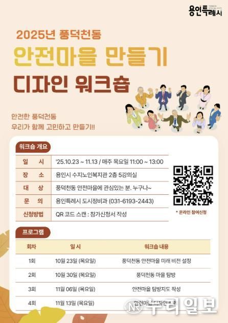 (누리일보) 용인특례시는 수지구 풍덕천동 ‘안전마을 만들기 디자인 워크숍’ 참가자를 모집 중이라고 15일 밝혔다.