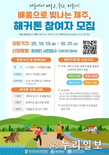 (누리일보) 제주평생교육장학진흥원은 '제주가치 공감, 런케이션'사업의 일환으로 ‘배움으로 빛나는 제주, 해커톤’을 개최하며, 오는 10월 31일까지 참가자를 모집한다고 밝혔다.
