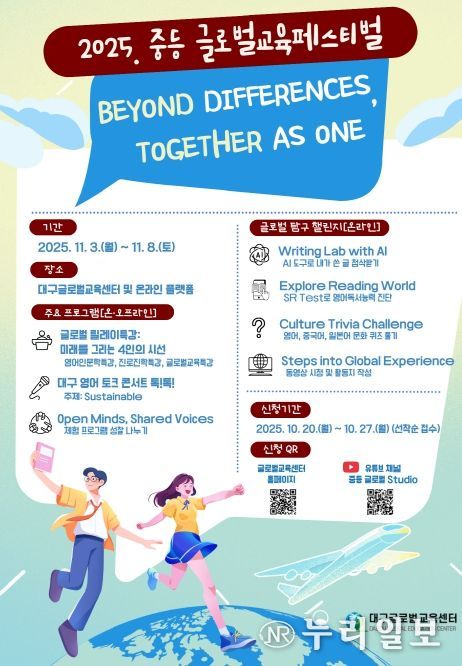 (누리일보) 대구교육연수원 산하 대구글로벌교육센터는 11월 3일부터 8일까지 ‘Beyond Differences, Together as One(차이를 넘어, 하나로)’을 주제로 '2025 중등 글로벌교육페스티벌'을 개최한다.