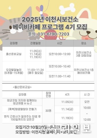 (누리일보) 이천시는 임산부 및 6개월~15개월 영아의 보호자를 대상으로 10월 20일부터 ‘베이비카페 프로그램 4기’ 대상자를 선착순으로 모집 중이다. 온라인 신청(이천시청 누리집-교육포털-교육 강좌 신청)을 통해 선착순으로 접수하며 오감 발달 놀이의 경우 각 12명씩을 모집한다.