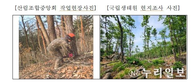 또한, 작업현장 사진과 현지조사 사진을 비교한 결과, 큰나무 위주의 간벌로 인해 식생이 단순화되고 산림 구조가 훼손된 정황이 확인됐다.