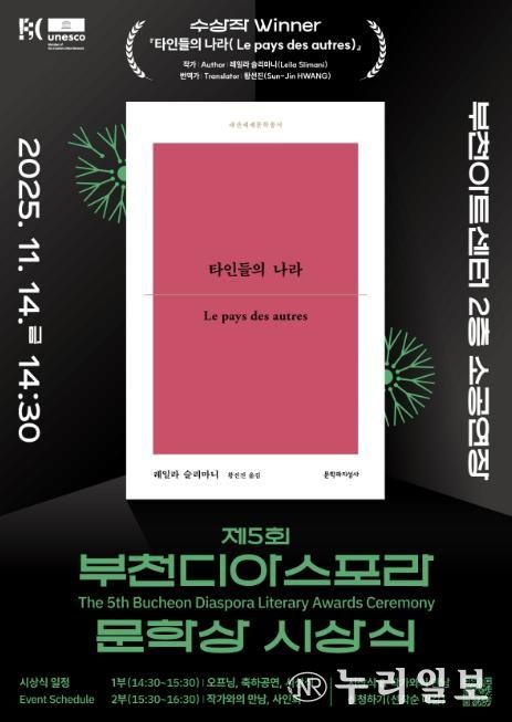 (누리일보) 부천시는 11월 14일 부천아트센터에서 열리는 ‘2025년 제5회 부천디아스포라문학상’ 시상식을 앞두고, 수상작으로 레일라 슬리마니 작가의 ‘타인들의 나라(Le pays des autres)’를 선정했다고 22일 밝혔다.