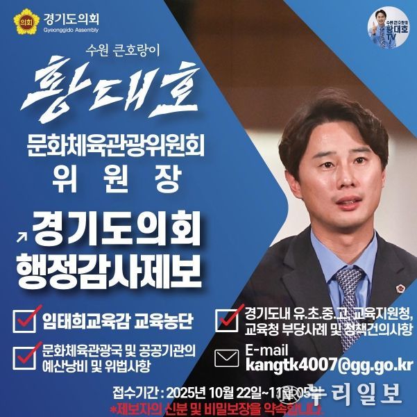 (누리일보) 경기도의회 문화체육관광위원회 황대호 위원장(더불어민주당, 수원3)이 2025년도 행정사무감사를 앞두고 도민들을 대상으로 공개제보를 받는다고 SNS 등을 통해 알렸다.