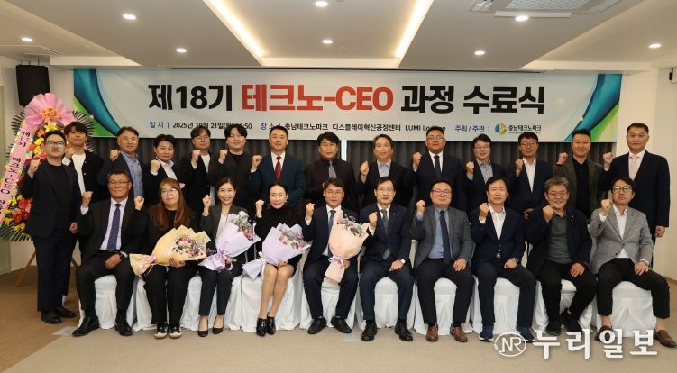 ‘제18기 테크노-CEO 과정’에는 충남지역 주요 기업대표 및 임원 등 30명이 참여했으며, △경영 품질 전략 △법률 △노무 상식 △AI 플랫폼 이용 △정책 이해 등 실무 중심의 교육을 통해 변화하는 산업 환경에 대응할 혁신리더로 성장할 역량을 다졌다.