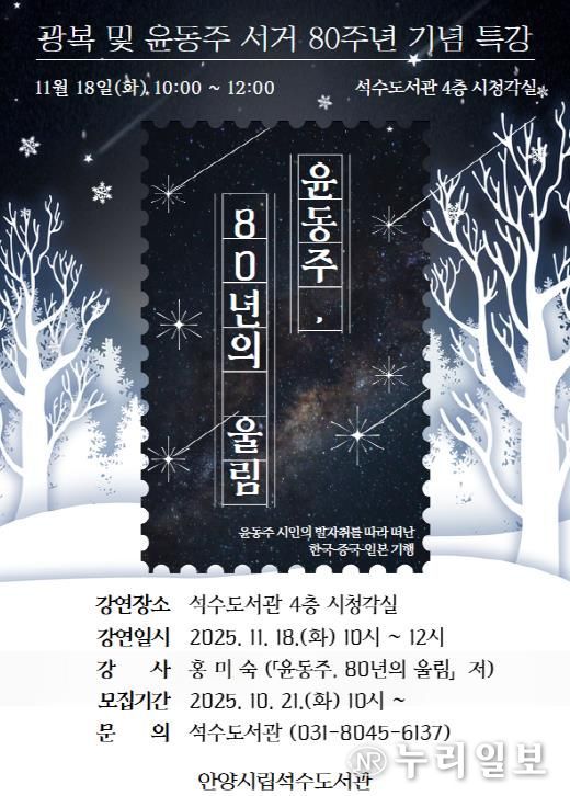 (누리일보) 안양시 석수도서관은 광복 및 윤동주 서거 80주년을 맞이하여 11월 18일 화요일 오전 10시에 ‘윤동주, 80년의 울림’이라는 제목으로 특강을 운영한다고 23일 밝혔다.
