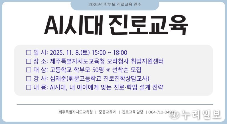 (누리일보) 제주특별자치도교육청은 11월 8일 오후 3시 도교육청 오라청사 취업지원센터에서 도내 고등학교 보호자 50명을 대상으로 ‘인공지능 시대 진로교육’ 연수를 운영한다고 밝혔다.