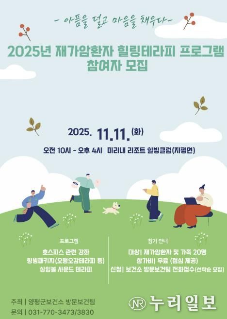 (누리일보) 양평군은 재가암환자와 그 가족을 대상으로 ‘2025년 재가암환자 힐링테라피 프로그램’ 대상자를 모집한다고 밝혔다. 프로그램은 오는 11월 11일, 양평 미리내 리조트 내 힐빙클럽에서 진행될 예정이며, 총 20명을 모집한다.