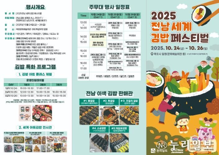 (누리일보) 전라남도는 24일부터 26일까지 목포 남도국제미식산업박람회에서 2025 전남 세계 김밥페스티벌을 개최한다.
