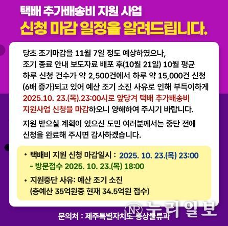 (누리일보) 제주특별자치도는 택배 추가배송비 지원 사업이 당초 11월 7일 종료 예정이었으나, 신청 급증으로 10월 23일 오후 11시(방문 접수 오후 6시)에 조기 종료된다고 밝혔다.