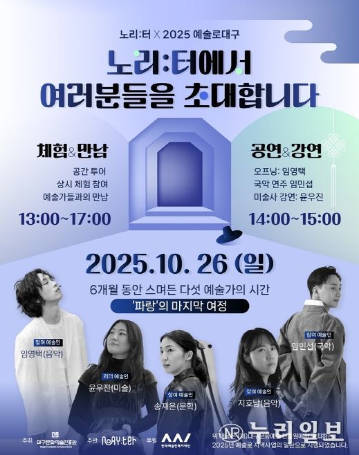 (누리일보) 대구문화예술진흥원 문화예술본부는 ‘2025 예술인파견지원사업–예술로 대구’의 일환으로, ‘노리:터’와 협력해 추진한 예술 협업 프로젝트의 마지막 무대인 ‘선과 흥을 따라서: 김홍도와 신윤복’을 오는 10월 26일 오후 2시부터 개최한다.