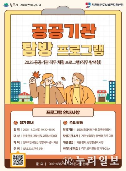 (누리일보) (재)강원혁신도시발전지원센터는 원주시 교육발전특구 사업의 일환으로, 오는 11월 3일 원주권 내 청년들의 공공기관 진로 탐색 지원하기 위한 ‘2025 공공기관 직무 체험 프로그램(직무 탐색형)_공공기관 탐방’을 운영한다.