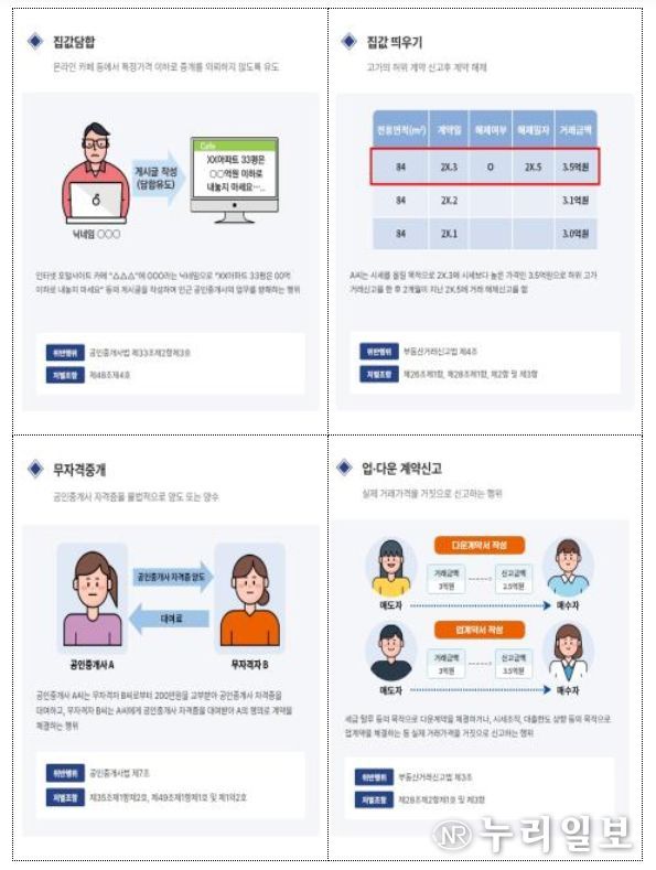 국토교통부는 집값담합, 시세교란(집값 띄우기 등) 및 인터넷 중개대상물 불법 표시·광고 등 부동산거래질서교란행위 전반에 대해 ‘부동산 불법행위 통합 신고센터’를 통해 접수 받고 있으며, 신고된 사례에 대해서는 지자체 등과 협력해 엄정 대응해 나갈 계획이다.