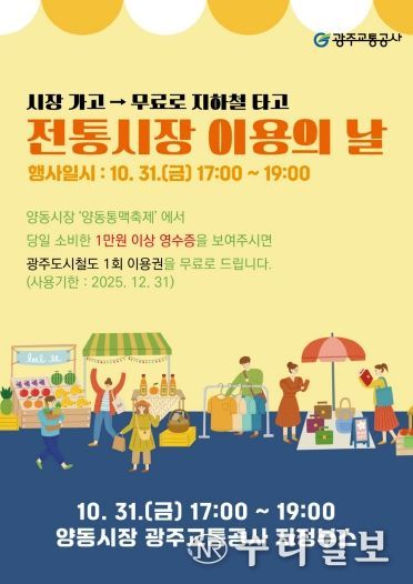 (누리일보) 광주교통공사(사장 조익문)가 오는 31일 광주시 서구 양동시장에서 '10월 전통시장 이용의 날’ 행사를 펼치고, 지역 골목상권 활성화와 대중교통 이용 문화 확산에 나선다.