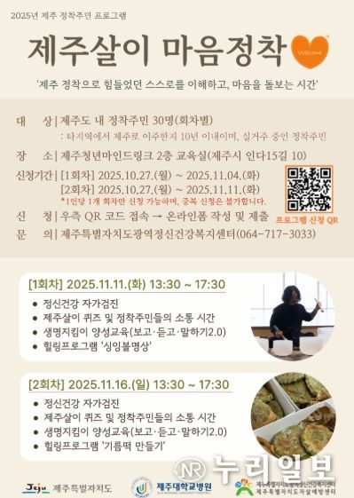(누리일보) 제주특별자치도와 광역정신건강복지센터는 정착주민의 정신건강 증진과 자살예방 인식 확산을 위해 '2025년 정착주민 자살예방 프로그램'에 참여할 도민을 모집한다.