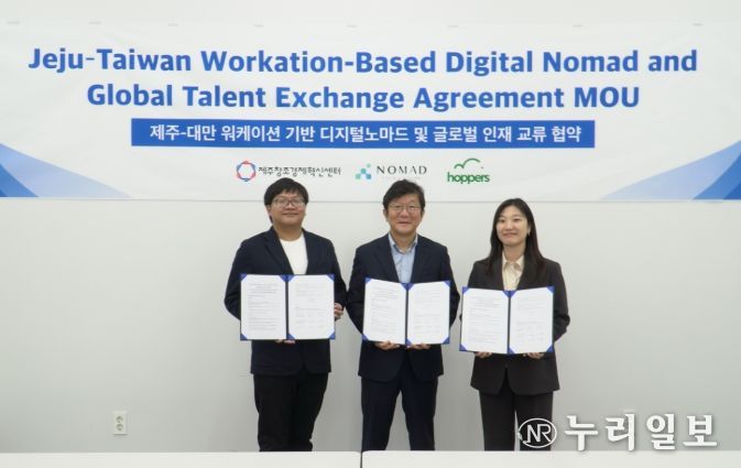 (누리일보) 제주창조경제혁신센터(대표이사 이병선, 이하 제주센터)는 오늘(24일) 대만 국가발전위원회 노마드 타이완 오피스(대표 Kai Hsu, 이하 노마드 타이완), 그리고 호퍼스(대표 조정현)와 함께 제주-대만 워케이션 기반 디지털노마드 및 글로벌 인재 교류 협약을 체결했다.