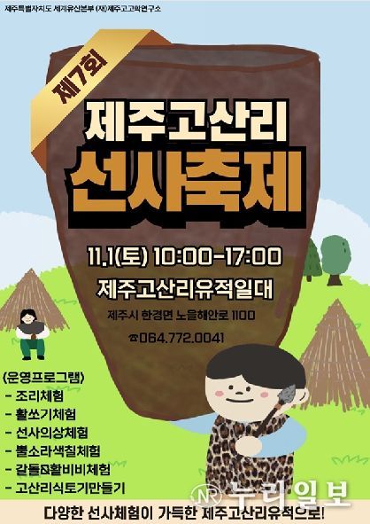 (누리일보) 제주특별자치도는 1만 년 전 신석기시대 사람들이 정착했던 고산리 유적 일대에서 11월 1일 ‘제7회 고산리 선사축제’를 연다. 제주 선사문화의 발상지에서 토기 만들기와 사냥 체험 등을 통해 신석기시대를 직접 체험할 수 있다.