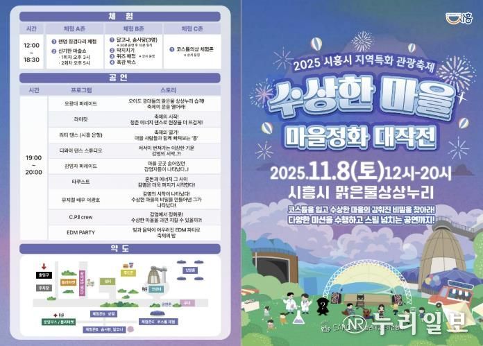 (누리일보) 시흥시는 2025년 시흥시 지역특화 관광축제 지원사업 선정 축제인 ‘수상한 마을 마을정화대작전’을 오는 11월 8일 정왕동 맑은물상상누리 일원에서 개최한다. 이번 축제는 시흥시 청년예술연합회가 주관한다.
