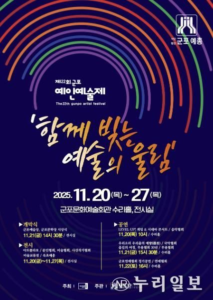 (누리일보) 2025년 제22회 군포 예인예술제가 11월 20일부터 27일까지 군포문화예술회관 전시실과 수리홀에서 8일간 진행된다.