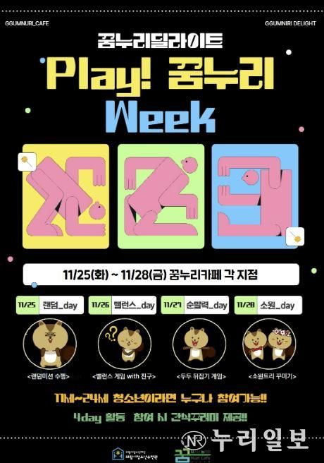 (누리일보) 의왕시청소년재단 산하 의왕시청소년수련관 꿈누리카페(▲고천점( 문화공원로 33), ▲내손점(복지로 109), ▲오전점(찬우물길 11), ▲백운밸리점(백운중앙로 74, 총 4개 지점))는 오는 11월 25일부터 28일까지 4일간 꿈누리딜라이트 『Play! 꿈누리 Week』를 진행한다고 밝혔다.