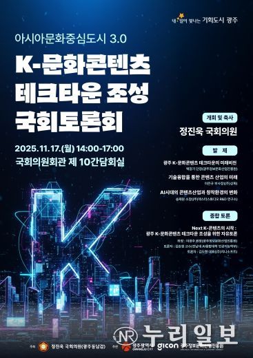 (누리일보) 광주광역시가 오는 17일 오후 2시 국회의원회관 2층 간담회실에서 ‘K-문화콘텐츠 테크타운 조성 국회토론회’를 개최한다.