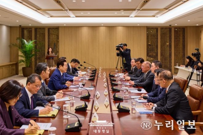 (누리일보) 이재명 대통령은 16일 오후 2시부터 2시간 넘게 대통령실 회의실에서 이재용 삼성전자 회장, 최태원 SK그룹 회장, 정의선 현대차그룹 회장, 구광모 LG그룹 회장, 여승주 한화그룹 부회장, 정기선 HD현대 수석부회장, 서정진 셀트리온 회장 등 경제인들과 산업부 장관 그리고 안보실장, 정책실장, 경제안보비서관 등이 참석한 가운데 '관세협상 후속 민관 합동회의'를 주재했다.
