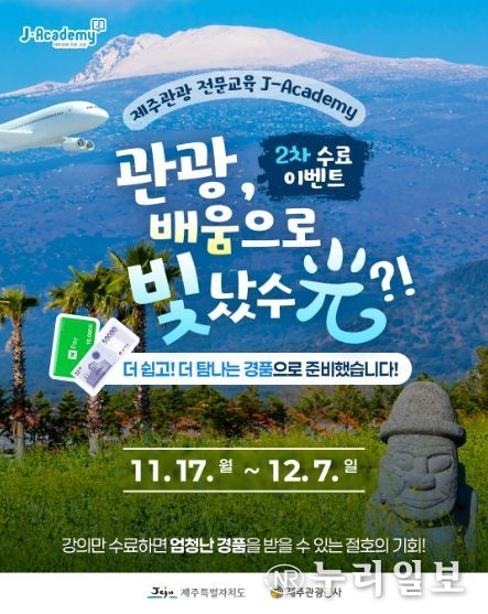 (누리일보) 제주관광공사는 오는 12월 7일까지 ‘제주관광 전문교육 J-Academy’ 온라인 플랫폼에서 교육 수료 이벤트를 진행하고 있다고 17일 밝혔다.