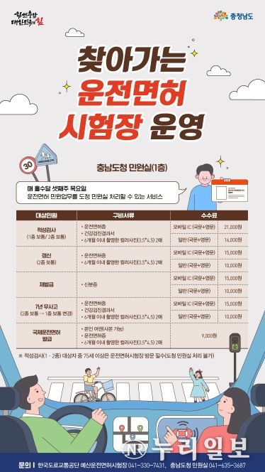 찾아가는 운전면허시험장은 한국도로교통공단 예산운전면허시험장과 협력해 운전면허 관련 민원 업무를 도청 민원실에서 직접 처리하는 서비스로, 내포신도시 인근 거주 도민들에게 큰 호응을 얻고 있다.