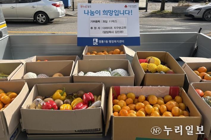 (누리일보) 지난 17일, 용인시 소재 더라이프지구촌교회 광교채플에서 추수감사절을 맞아 영통1동 행정복지센터에 샤인머스켓, 망고, 파인애플, 배, 귤, 사과, 감 등 과일 11박스를 기부했다.