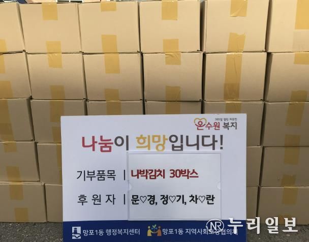 (누리일보) 수원시 영통구 망포1동행정복지센터는 지난 17일, 망포1동 주민 3명이 저소득 취약계층을 위해 나박김치 30박스를 후원했다고 밝혔다.