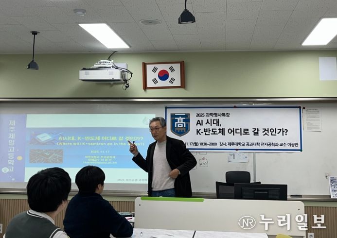 (누리일보) 제주도교육청 제주제일고등학교는 17일 지구과학실에서 1학년 학생 20명을 대상으로 ‘인공지능 시대, 케이(K)-반도체 어디로 갈 것인가?’를 주제로 과학명사특강을 실시했다.