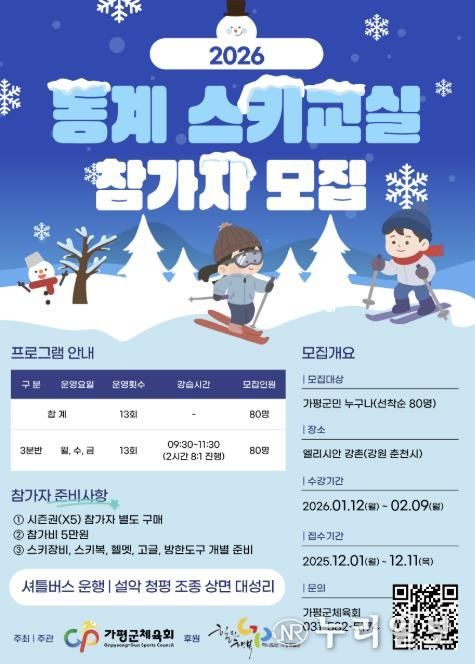 (누리일보) 가평군체육회가 주최하고 가평군이 후원하는 ‘2026 동계스포츠 스키교실’에서 참여인원 80명을 선착순으로 모집한다.