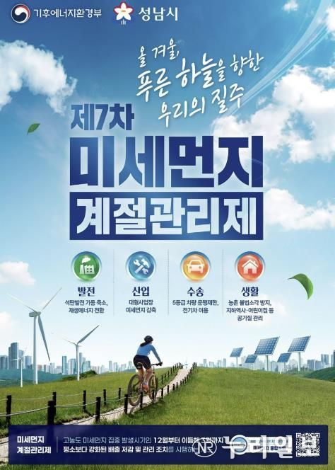 (누리일보) 성남시는 오는 12월 1일부터 내년 3월 말일까지 ‘제7차 미세먼지 계절관리제’를 시행한다.
