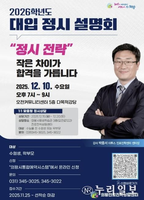 (누리일보) 의왕시가 12월 10일 저녁 7시부터 오전커뮤니티센터 5층 강당에서 ‘2026학년도 대입 정시 지원전략 설명회’를 개최한다.