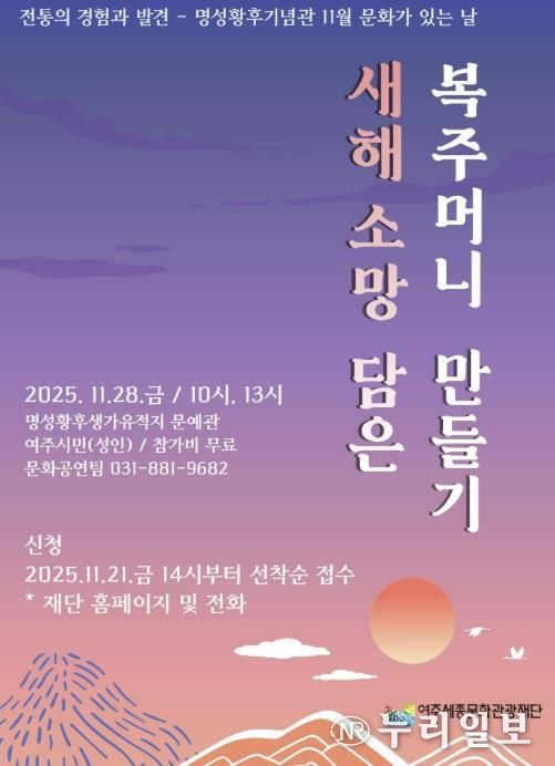 (누리일보) 여주세종문화관광재단은 오는 11월 28일, 명성황후기념관 11월 문화가 있는 날 프로그램으로‘새해 소망 담은 복주머니 만들기’를 진행한다.