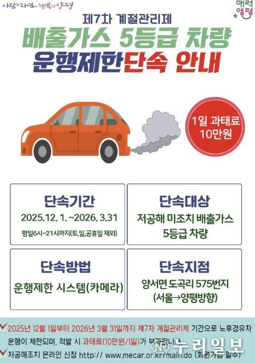 (누리일보) 양평군(은 오는 12월 1일부터 2026년 3월 31일까지 제7차 미세먼지 계절 관리제 시행에 따라 배출가스 5등급 차량에 대한 운행 제한 단속을 시행한다고 밝혔다.