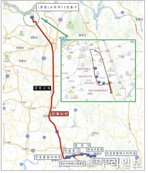 신설 광역버스는 안성종합버스터미널을 기점으로 안성맞춤공감센터, 한경국립대학교, 중앙대·롯데캐슬아파트, 대림동산, 공도시외버스정류장, 주은·풍림아파트를 거쳐 서울시인재개발원 입구, 남부터미널, 서울교대사거리, 교대역을 운행하는 노선으로, 차량 6대로 일 24회 운행하며 배차간격은 30~50분이다.