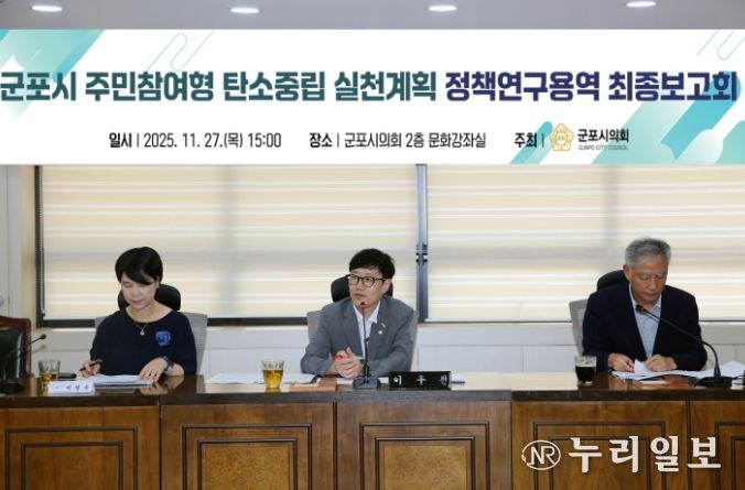 (누리일보) 군포시의회 더불어민주당 이우천 의원이 대표의원으로 주도하는 군포시 탄소중립연구모임이 11월 27일 군포시의회 2층 문화강좌실에서 '군포시 주민참여형 탄소중립 실천계획 정책연구용역 최종보고회'를 개최했다.