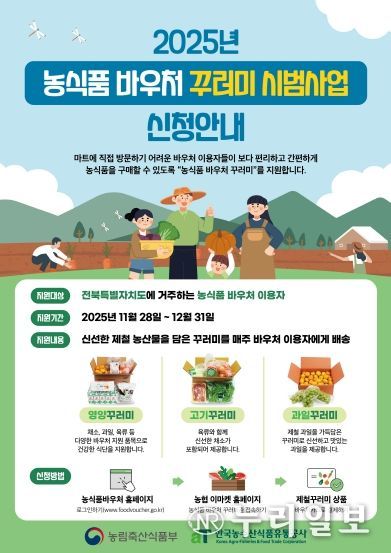(누리일보) 전북특별자치도는 도내 농식품 바우처 이용자가 거주지역에 관계없이 꾸러미 상품을 쉽고 편리하게 주문할 수 있도록 하기 위해 ‘2025년 농식품 바우처 꾸러미 시범사업’을 시작한다.