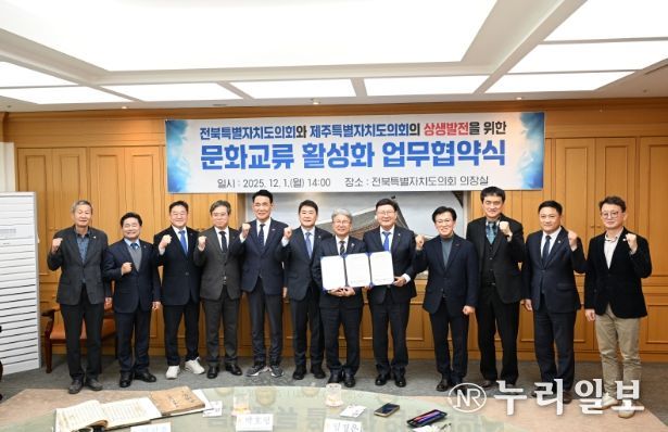 (누리일보) 제주특별자치도의회는 12월 1일 오후 14시 전북특별자치도의회 의장실(의장 문승우)에서 전북특별자치도의회와 문화교류 활성화 및 지역 상생발전을 위한 업무협약(MOU)을 체결했다고 밝혔다.