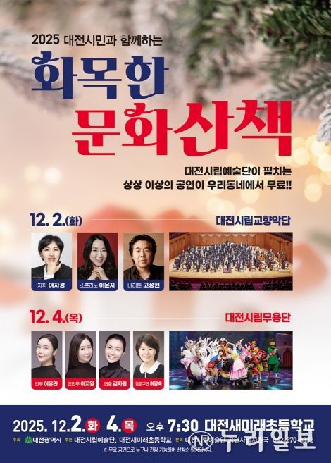 대전시립예술단 관계자는 “가족, 이웃과 함께 즐길 수 있는 ‘화목한 문화산책’을 통해 일상의 순간이 예술로 특별해지길 바란다”라며 “올해의 마지막 공연인 만큼 많은 주민이 찾아오셔서 따뜻하고 풍성한 연말 추억을 만들어 가시길 바란다”라고 전했다.
