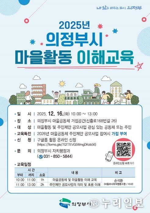 (누리일보) 의정부시는 12월 16일 의정부시 마을공동체 거점공간(신흥로168번길 26)에서 마을공동체에 대한 시민들의 참여 확대와 지속적인 관심을 유도하기 위한 ‘2025년 마을활동 이해교육’을 운영한다.